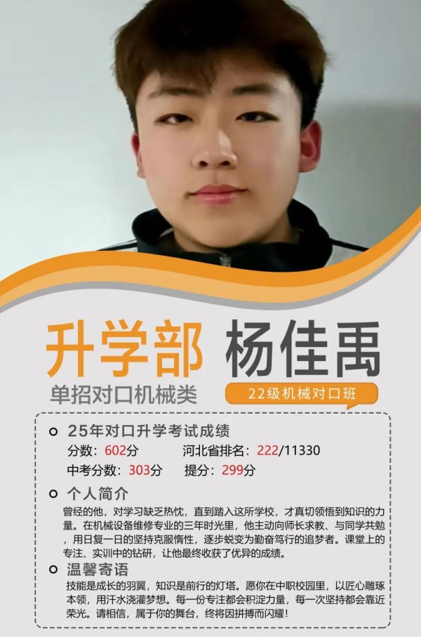 同时,22机械对口班的16名同学在对口单招考试中奋勇拼搏,4名同学成绩突破600分大关,其中2人闯入河北省前100名,10人跻身前500名。陈文凯、王梓洋、杨浩宇三位同学更是凭借出色的表现,被唐山工业职业技术大学成功录取,开启了他们在机械领域的新篇章。