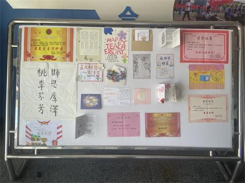 学生们还准备了清雅的鲜花,为节日增添了自然的馨香。爱好书法的同学们挥毫泼墨,一幅幅“桃李满天下”“恩师情深”的书法作品,笔力遒劲,墨香四溢,以传统文化的形式表达着尊师重道的内涵。校园的祝福展板上,密密麻麻的文字汇成温暖的海洋,形成了校园里一道感人至深的风景线。