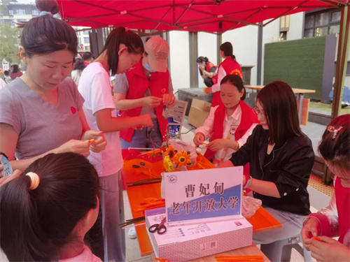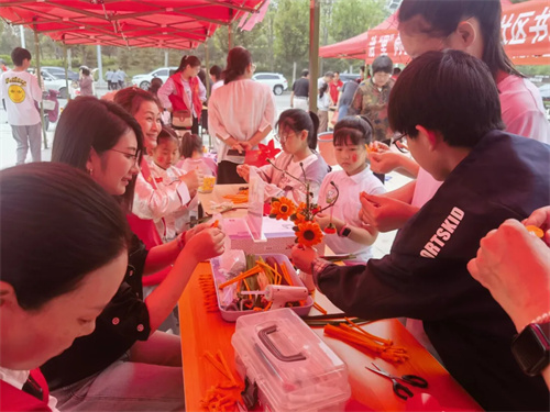 活动现场,曹妃甸老年开放大学的展位前人头攒动。色彩缤纷的扭扭棒、细长的铁丝、精巧的花杆等材料一摆上桌,就吸引了各个年龄段的居民驻足。在专业教师的耐心讲解和分步示范下,从未接触过手工的新手们也跃跃欲试。老人们戴起老花镜,手指灵活地缠绕、套网、组装;年轻妈妈带着孩子一起动手,体验手工的乐趣;几位中年邻居一边制作,一边交流心得,现场气氛热烈而融洽。